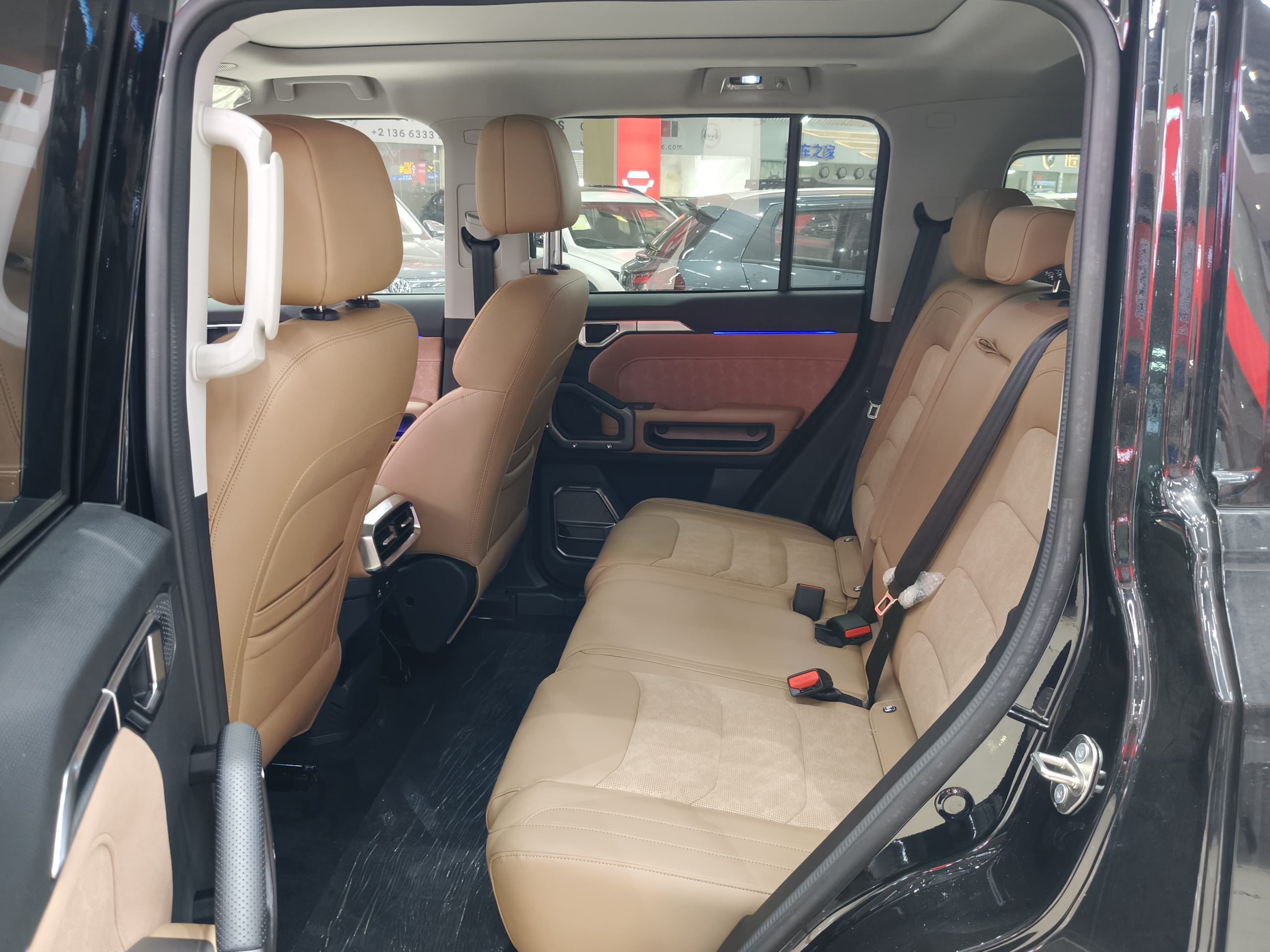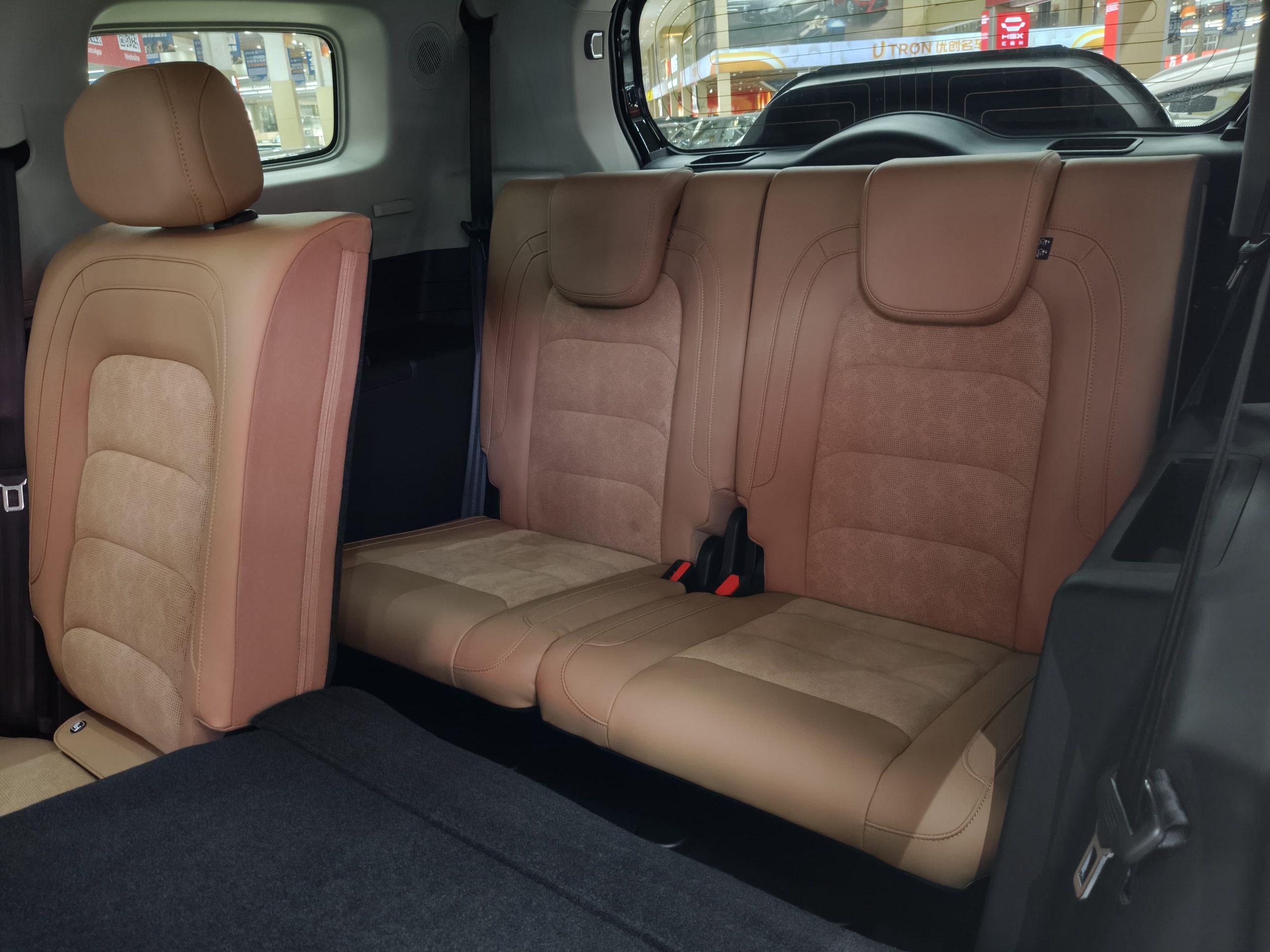 The vehicle's dimensions have been extended by 249mm, reaching 5034×2006×1880mm, with a wheelbase of 2800mm. It features a 2+3+2 seating configuration with seven seats. The third-row seat cushions offer a 450mm drop, 680mm of legroom, and 900mm of headroom, making it comfortable for adults on short trips. The middle row folds down in a 4/6 split, while the third row folds down in a 5/5 split, creating a flat area measuring 1980mm×1300mm×800mm, accommodating two single mattresses for a "mobile king-size bed" for outdoor camping. The trunk features a tiered design, with an upper compartment offering 820L of regular capacity and a lower compartment with a hidden 350L storage compartment, for a total capacity of 1653L. The low 780mm opening height and the foot-activated power tailgate make it easy to load large items such as camping gear and strollers. The three-row independent air-conditioning system is equipped with foot-mounted air outlets, which achieve full-area temperature balance through independent air ducts. It can cool down from a high temperature of 40°C to 25°C in 10 minutes, and heat up from a low temperature of -10°C to 18°C ​​in 15 minutes.