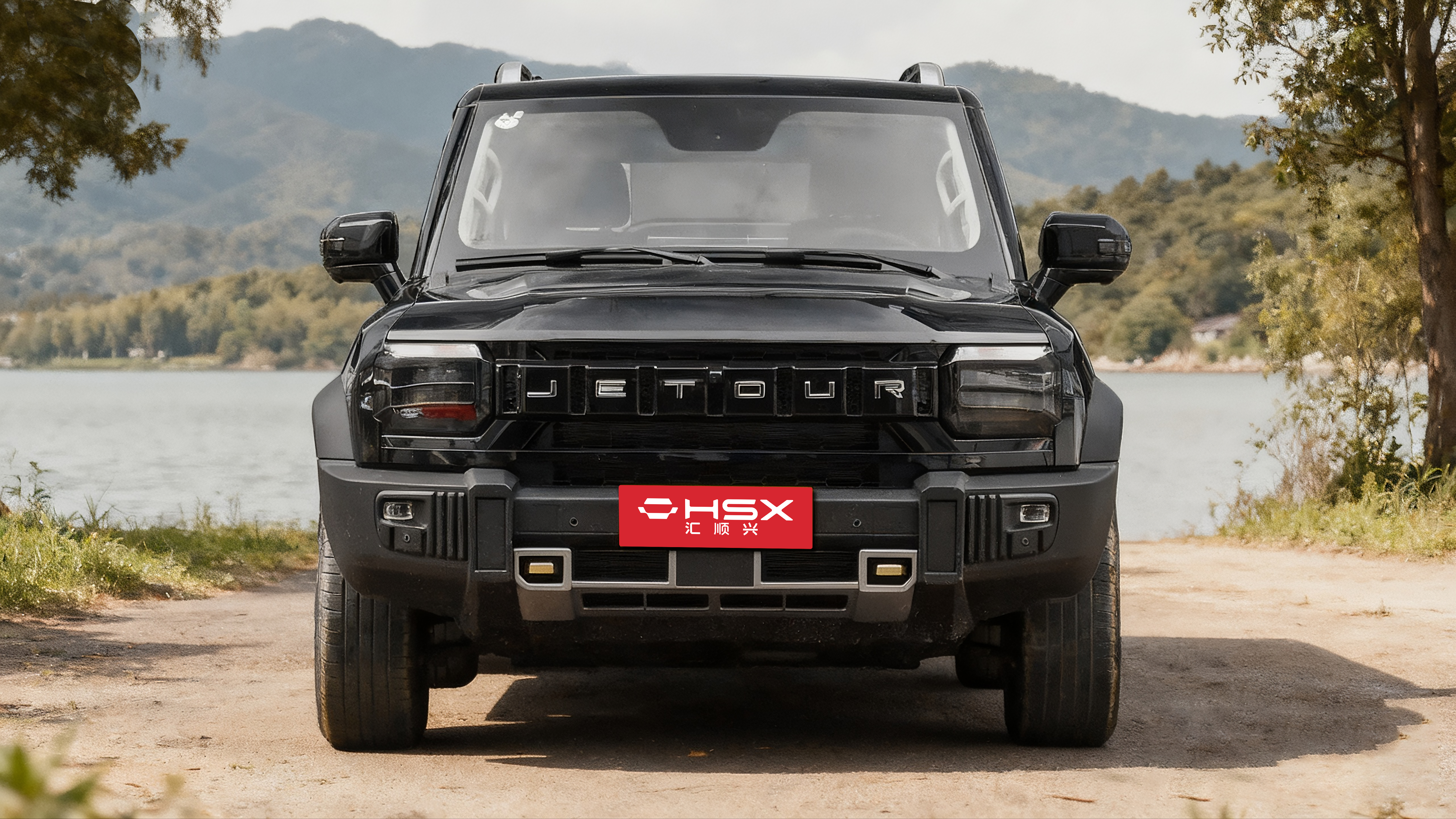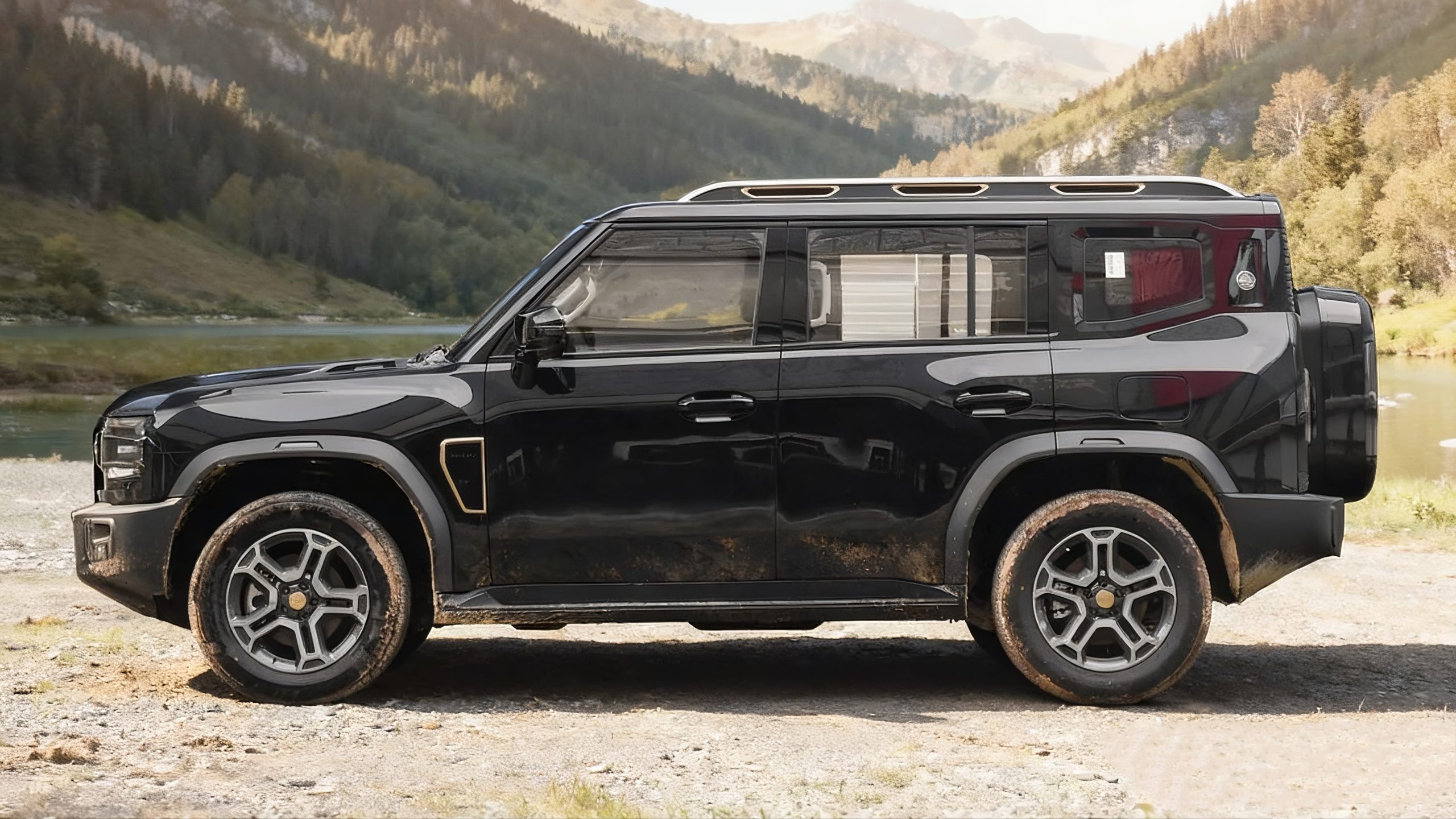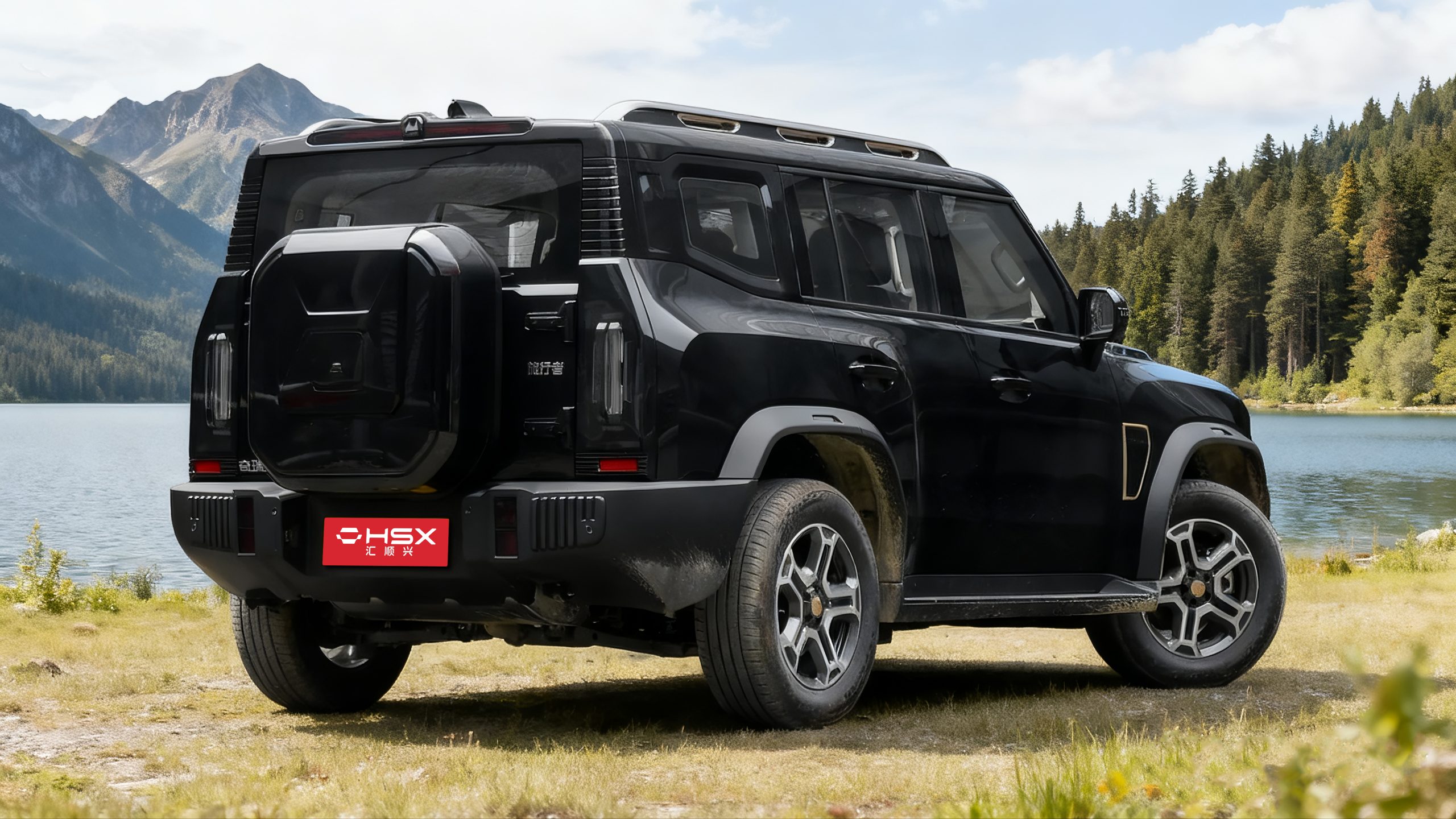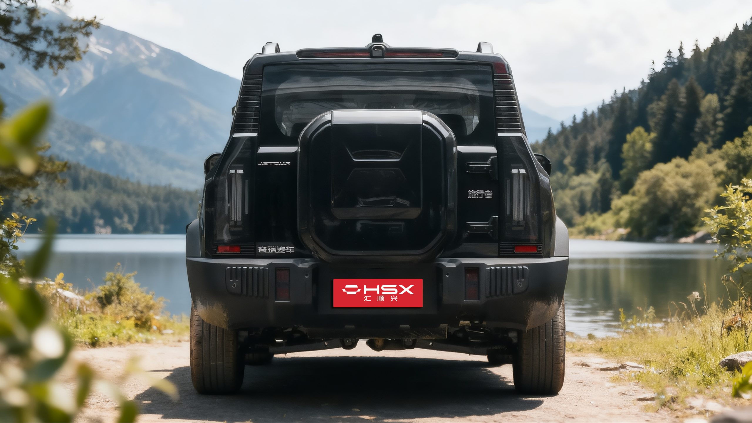 Continuing the iconic silhouette of a rugged SUV, the straight lines create a sense of power. The broad shoulders and floating roof create an off-road stance, embodying both natural and outdoor settings while also maintaining a stylish urban aesthetic. The tow hook, roof rack, A-pillar trim, and wheels are all painted champagne gold, creating a contrasting black exterior. The rear "small backpack" tool box integrates the tow hook, highlighting refined and practical details. The C-pillar features a silhouette of Mount Everest as a backdrop. The front bumper integrates independent fog lights and a tow hook. With a ground clearance of 220mm and approach and departure angles of 28°, the 235/65 R18 tires offer light off-road maneuverability comparable to that of a professional off-road SUV. The side-opening tailgate and rear-mounted tool box design provide convenient outdoor access while enhancing the rugged style.